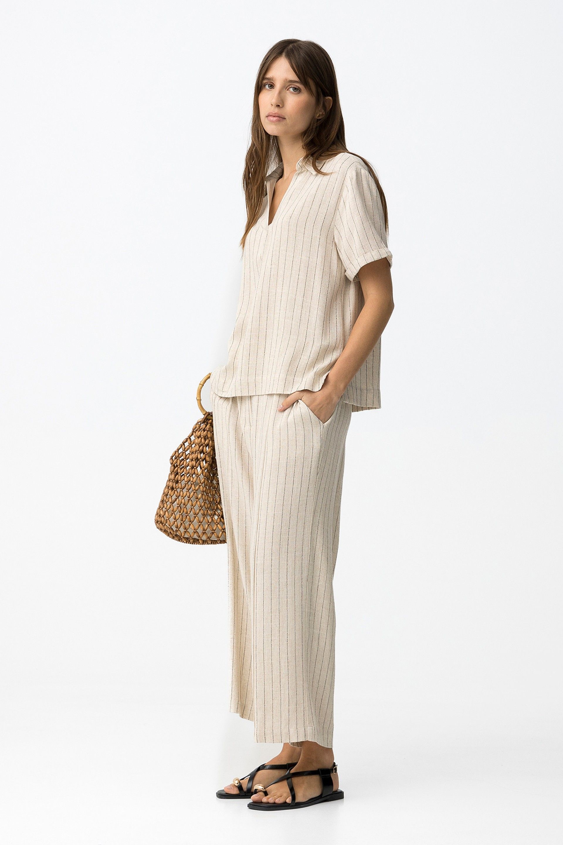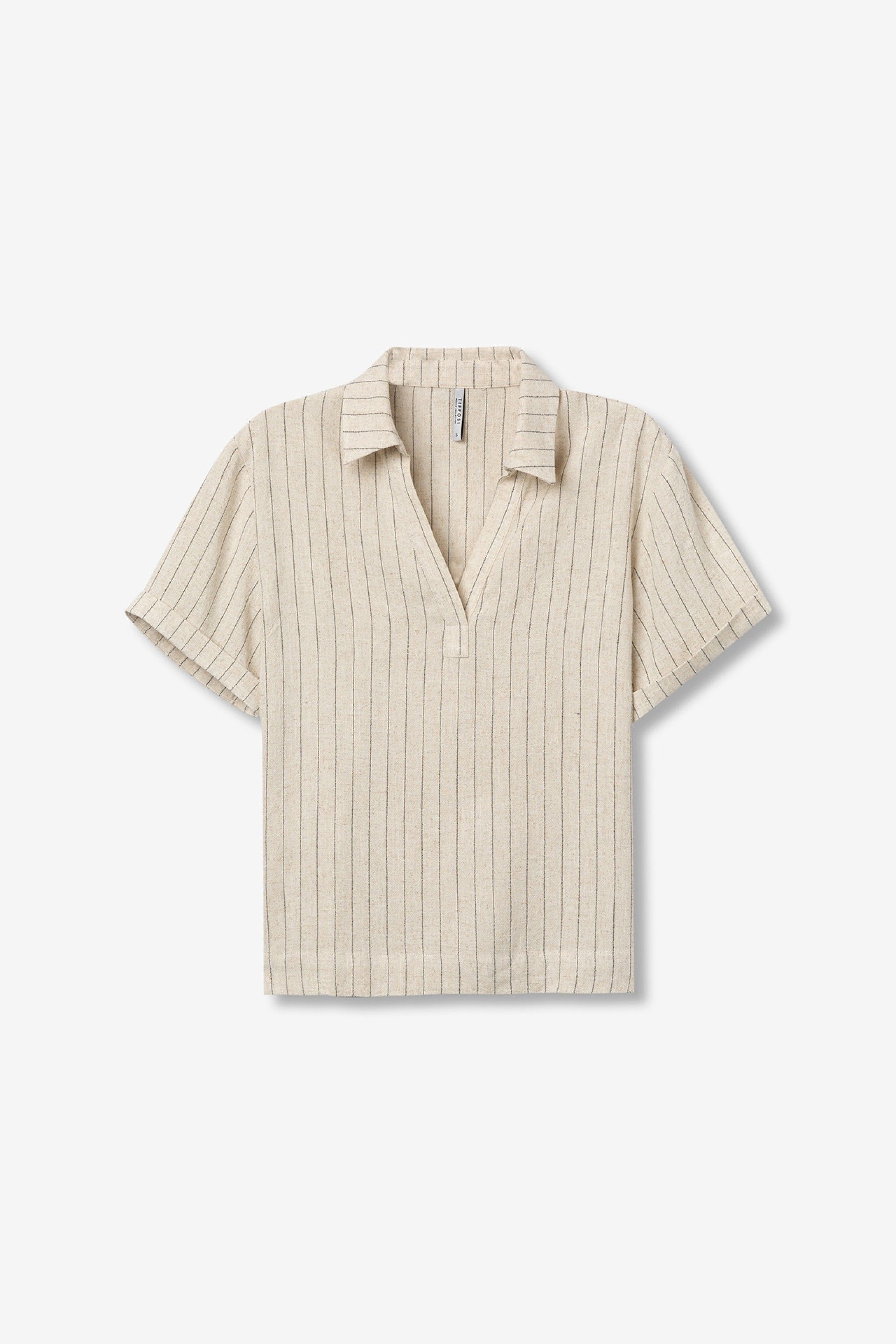 Luźna koszula w kolorze beżowym z cienkimi, pionowymi paskami, otwartym kołnierzykiem i krótkimi rękawami.